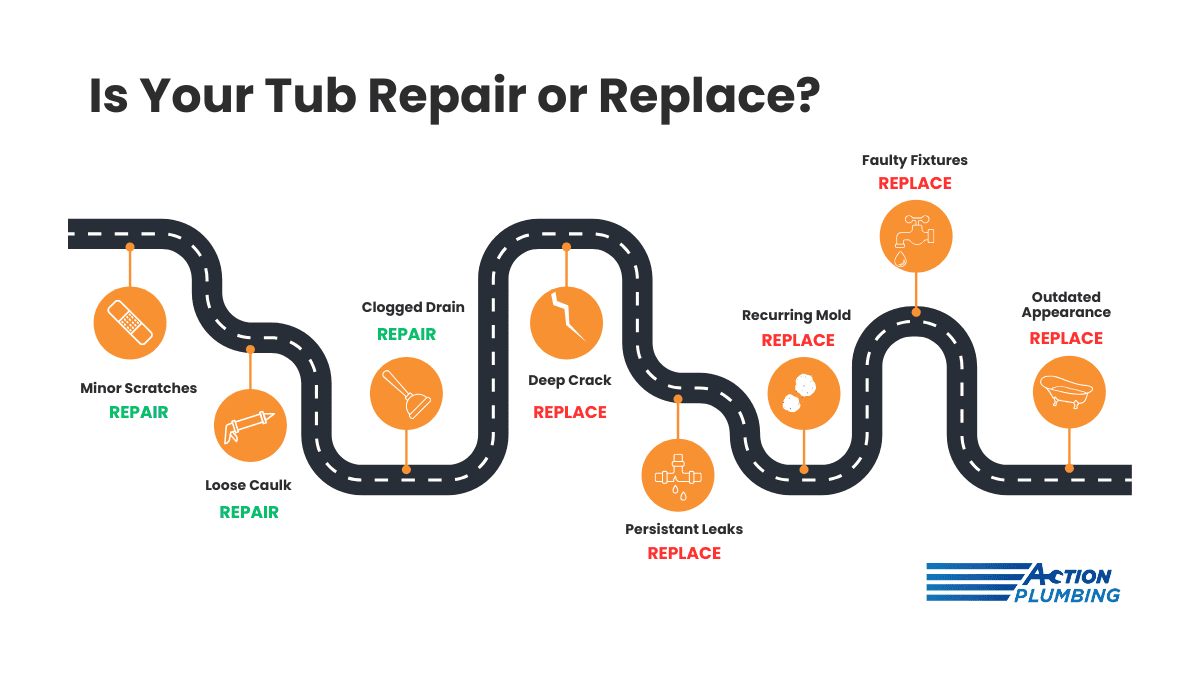 At Action Plumbing, we often get called in for tub “fixes.” While a quick patch can sometimes buy you time, there comes a point where continuing to repair an aging fixture is like pouring money down a leaky drain. In the unique environment of the OBX, coastal factors make the repair vs. replace decision even more critical.